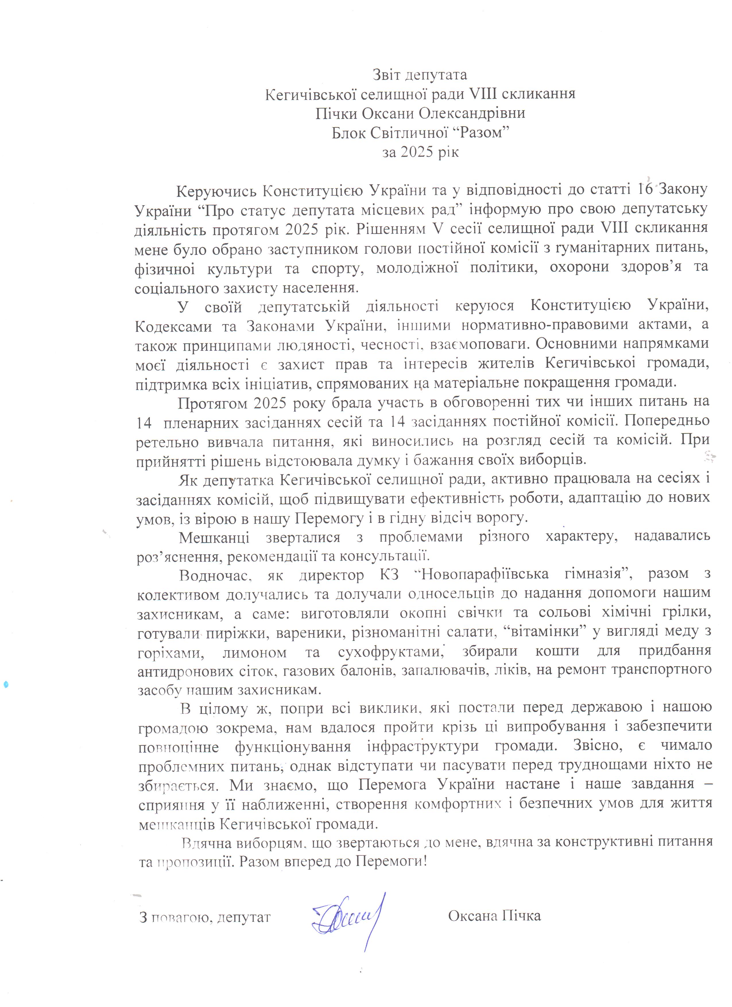 Звіт депутата Кегичівської селищної ради VIII скликання Пічки Оксани Олександрівни