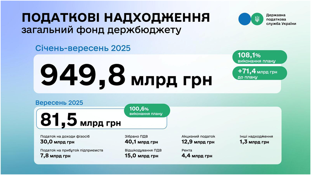 План вересня ДПС виконала на 100,6 %. Загалом до бюджету надійшло 81,5 млрд грн. Порівняно із вереснем 2024 року – це більше на 14,8 млрд грн (+22,2 %).