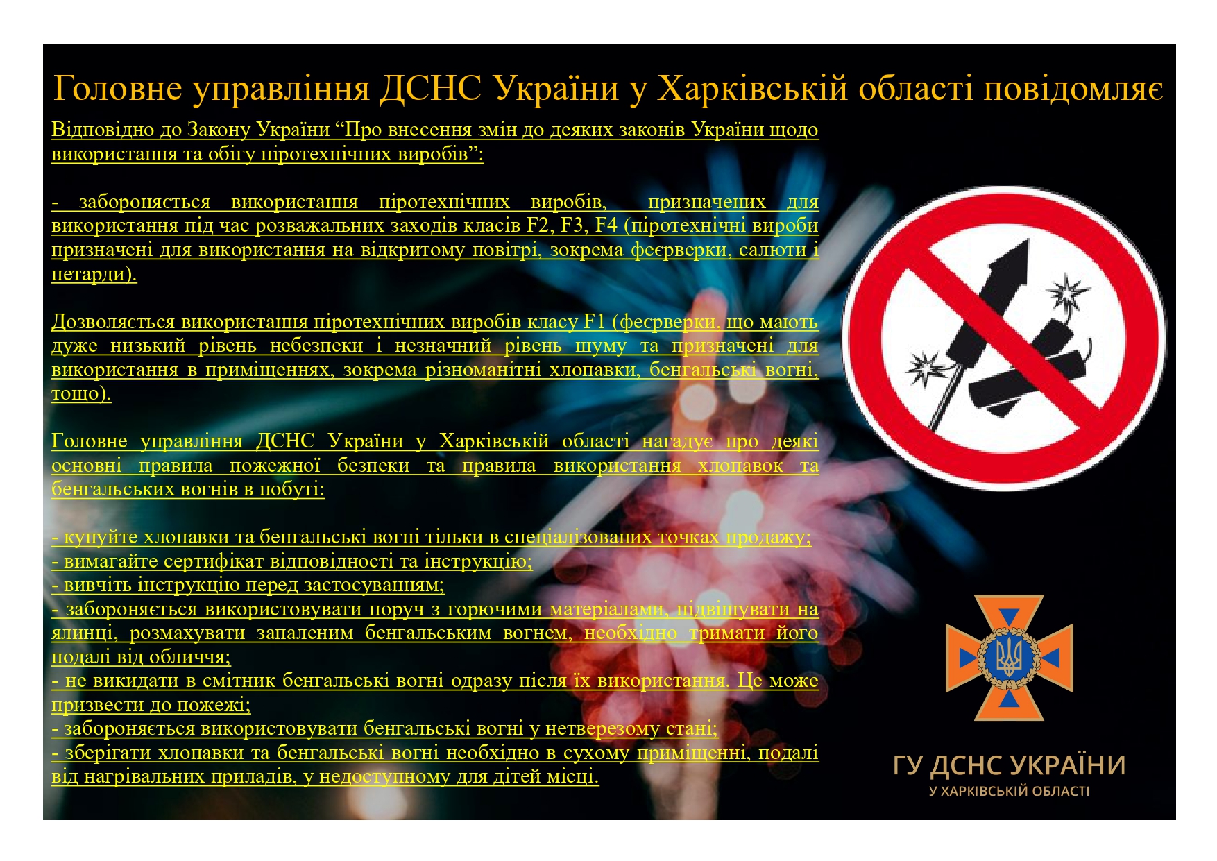 Берестинське районне управління цивільного захисту та превентивної діяльності Головного управління ДСНС України у Харківській області інформує про важливі зміни, передбачені Законом України щодо використання та обігу піротехнічних виробів.