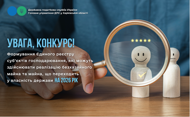 Головне управління ДПС у Харківській області проводить конкурс з формування Єдиного реєстру суб’єктів господарювання, які можуть здійснювати реалізацію безхазяйного майна та майна, що переходить у власність держави на 2026 рік.