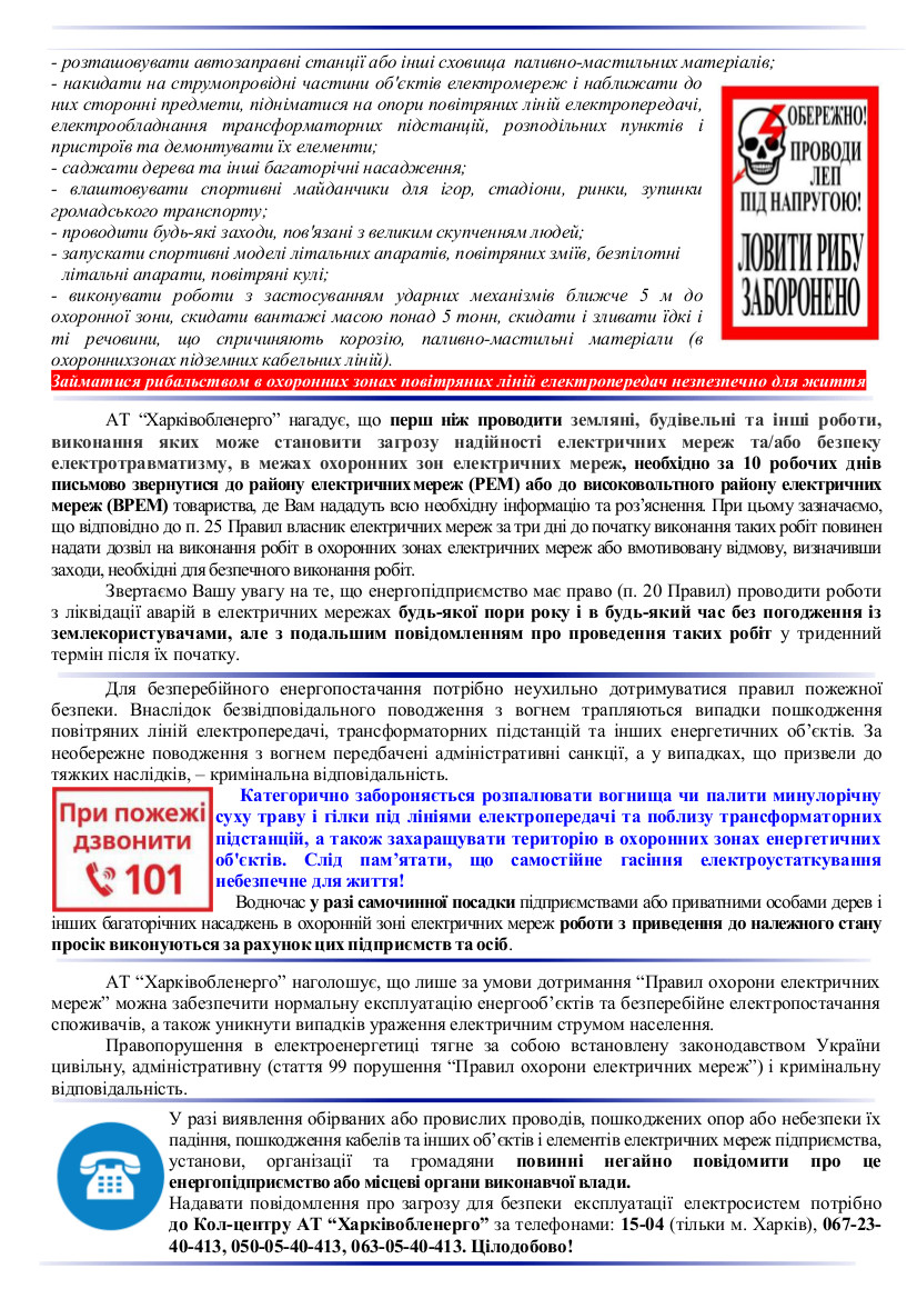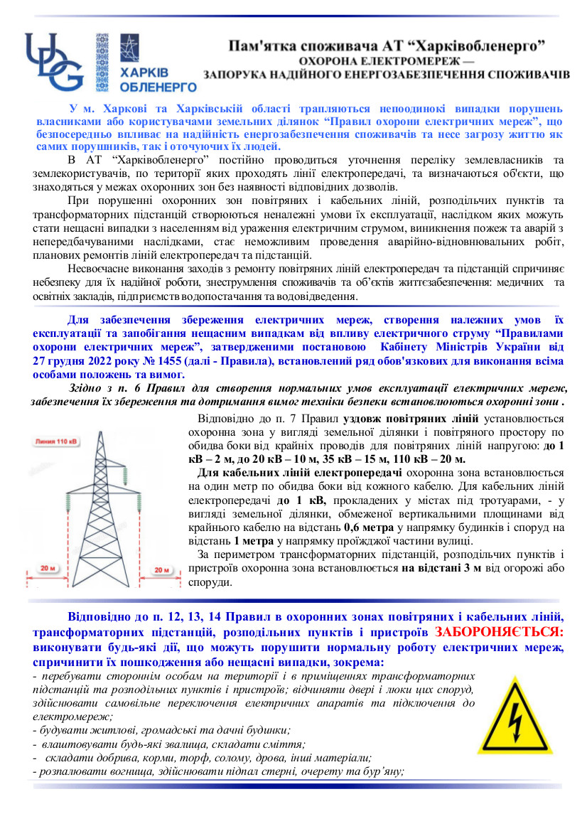 Пам'ятка споживача АТ "Харківобленерго". Охорона електромереж - запорука надійного енергозабезпечення споживачів