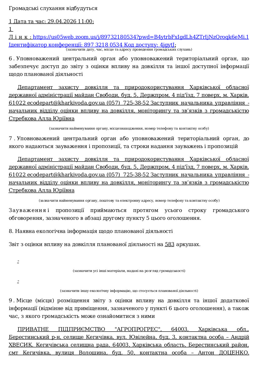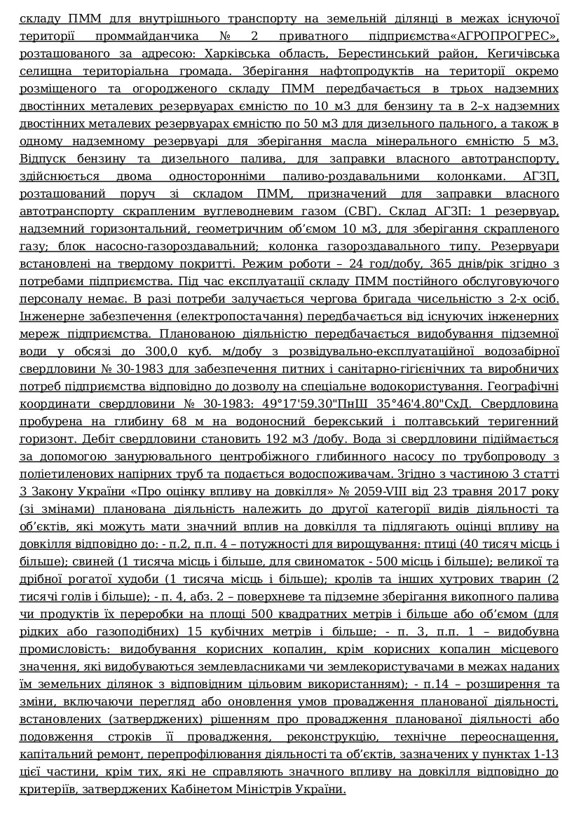 Звіт оцінки впливу на довкілля планової діяльності. ПРИВАТНЕ ПІДПРИЄМСТВО "АГРОПРОГРЕС"