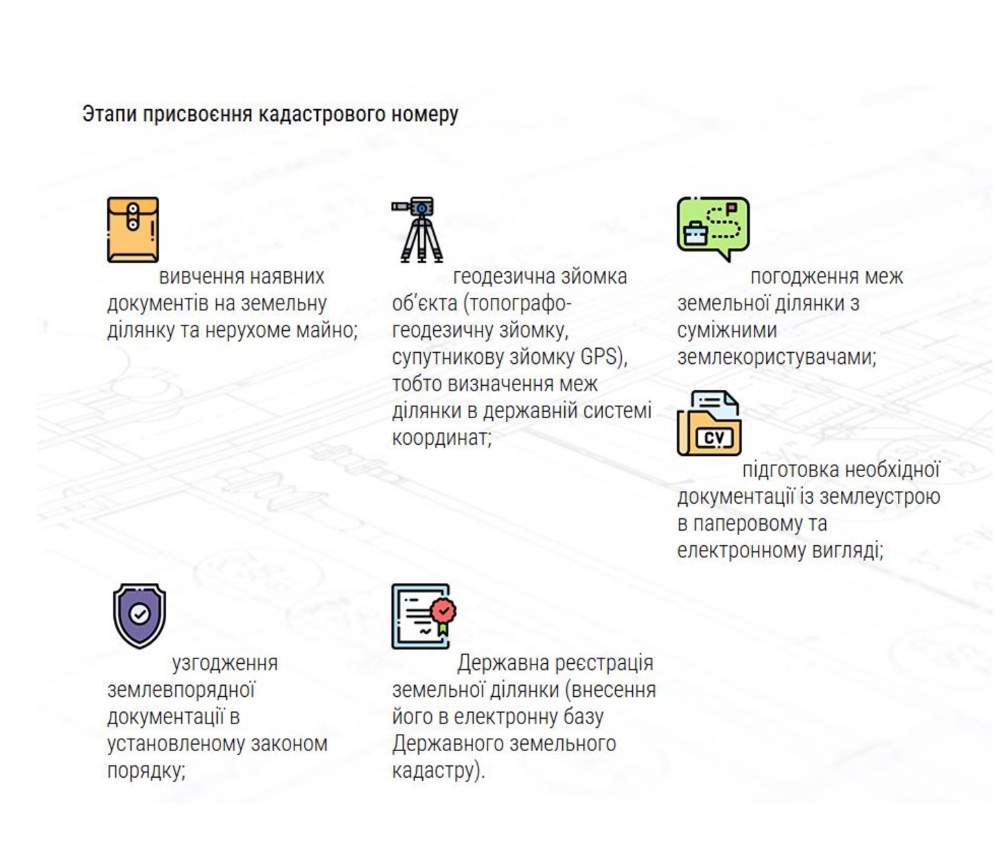 Кадастровий номер є істотною умовою договорів пов’язаних з переходом права власності на нерухоме майно (ст. 377 Цивільного кодексу України). Оформлення кадастрового номеру передбачає підготовку технічної документації із землеустрою або проекту відведення (в залежності від наявних документів на землю та об’єкти нерухомості) сертифікованими інженерами-землевпорядниками, які несуть відповідальність за дотриманням законодавства при виконанні землевпорядних робіт.