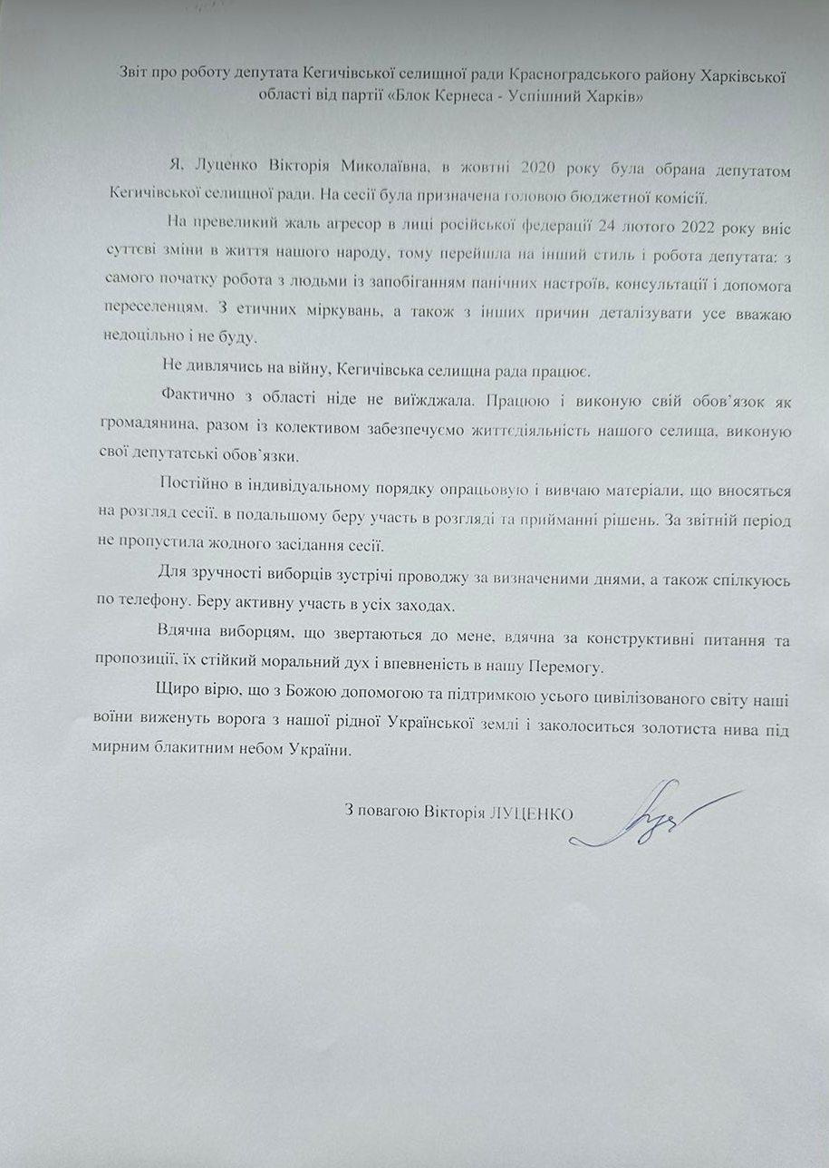Звіт депутата Кегичівської селищної ради VIII скликання Луценко Вікторії Миколаївни