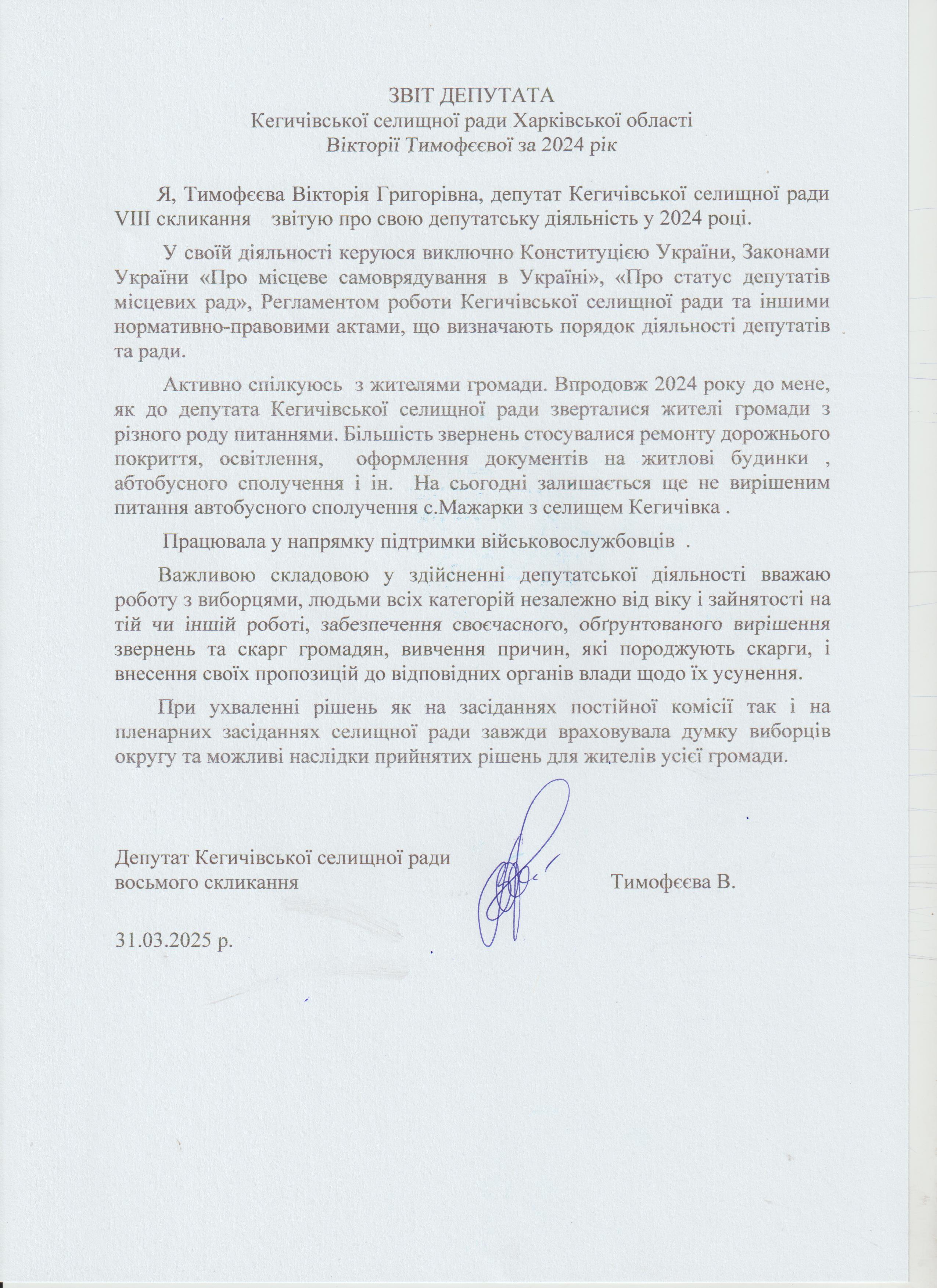 Звіт депутата Кегичівської селищної ради VIII скликання Тимофєєвої Вікторії Григорівни