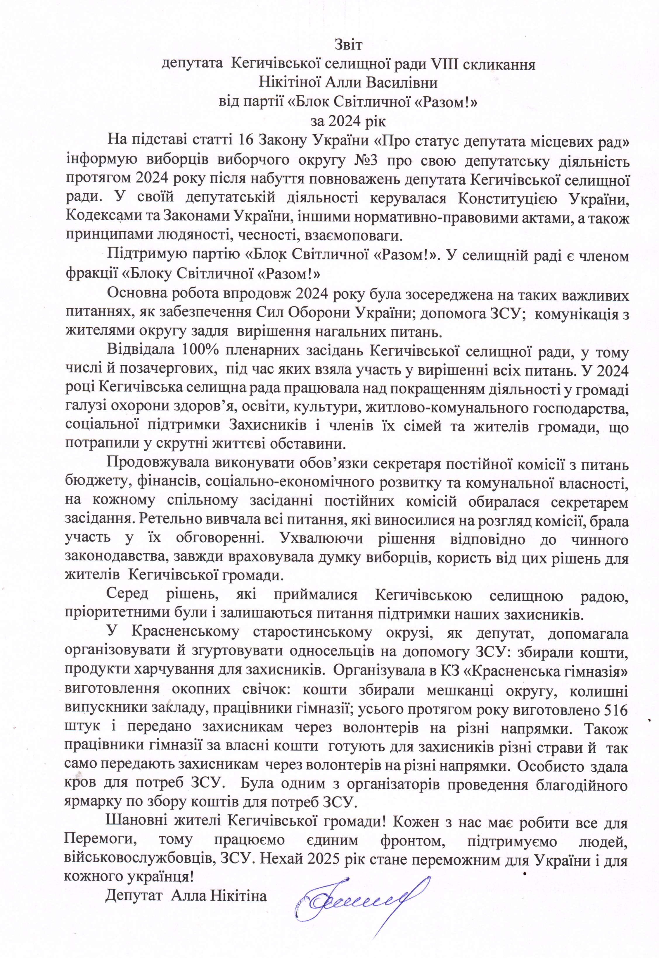 Звіт депутата Кегичівської селищної ради VIII скликання Нікітіной Алли Василівни