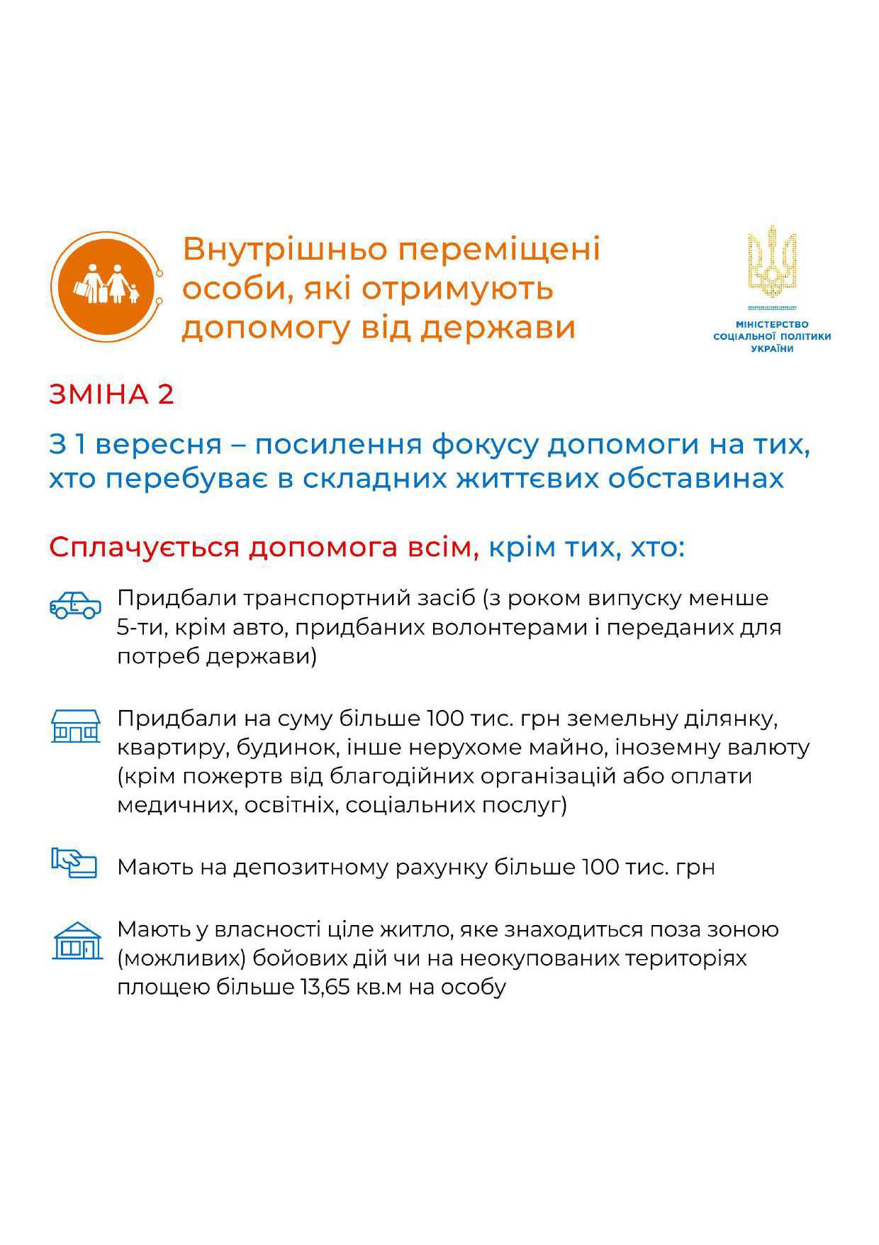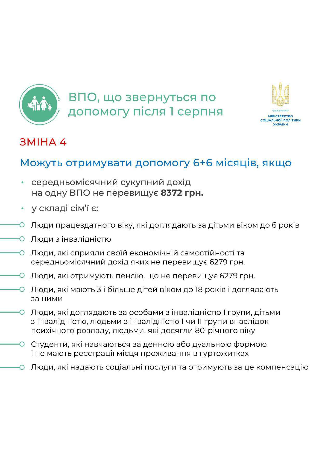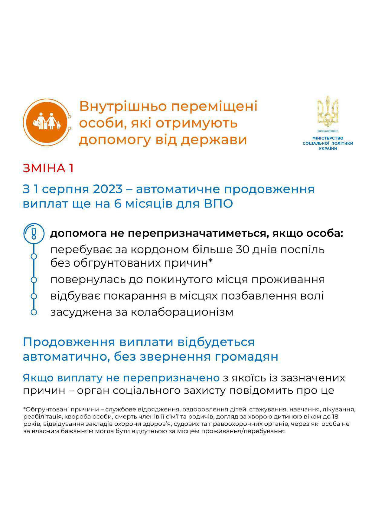 з 1 серпня 2023 року Допомога автоматично продовжується на 6 місяців для внутрішньо переміщених осіб, які вже до зазначеної дати отримують допомогу на проживання (крім тих, які перебувають за кордоном більш як 30 календарних днів підряд, відбувають покарання в місцях позбавлення волі, були засуджені за колабораціонізм, повернулися до постійного місця проживання);