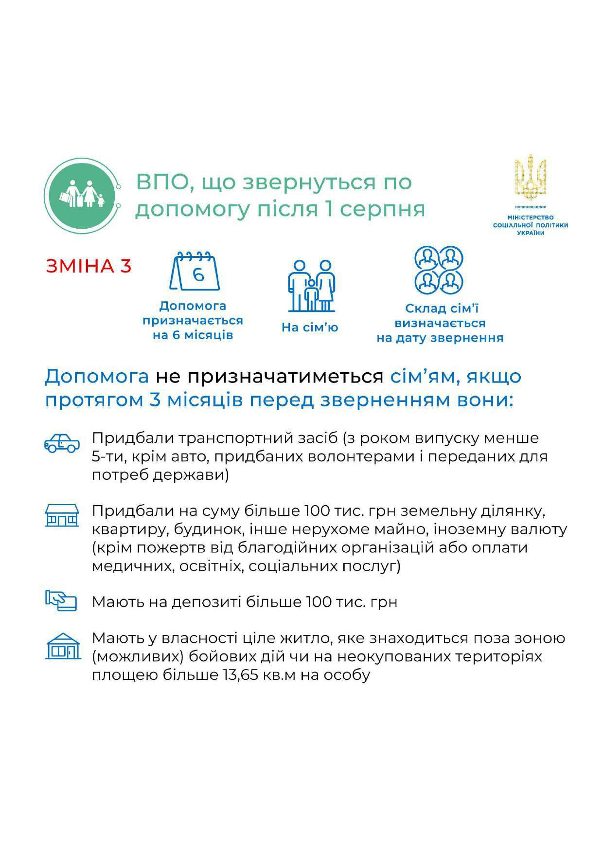 Допомога призначається на родину внутрішньо переміщених осіб з урахуванням соціального статусу, майнового стану кожного члена родини (Допомога направлена на осіб, які найбільше потребують);
