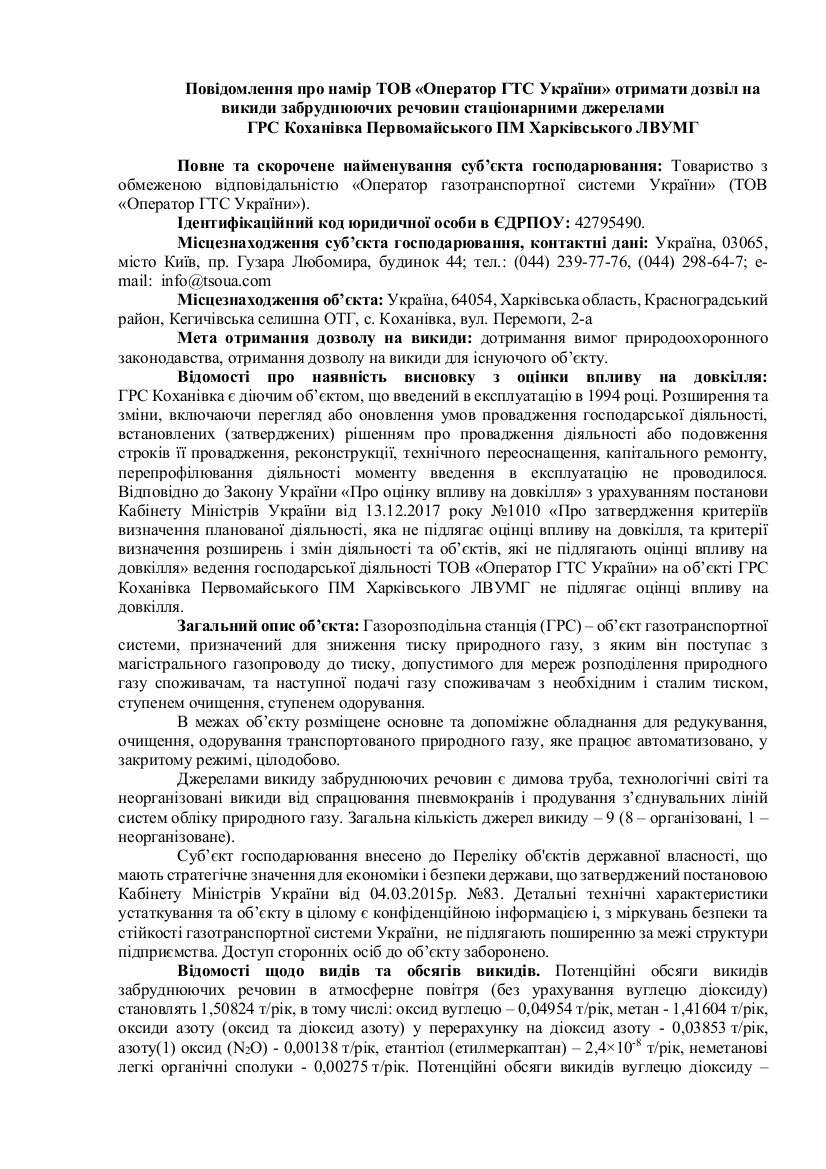 Повідомлення про наміри отримати дозвіл на викиди стаціонарними джерелами ГРС Коханівка