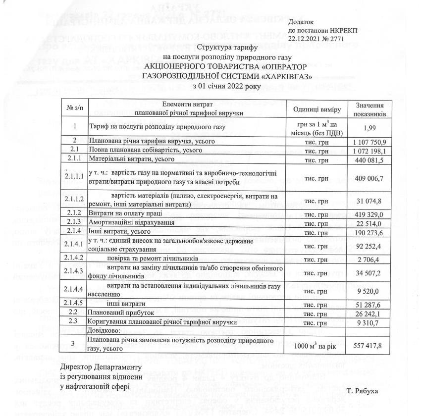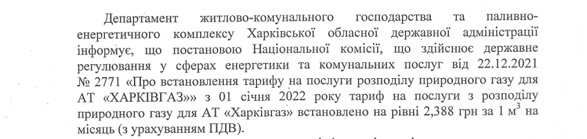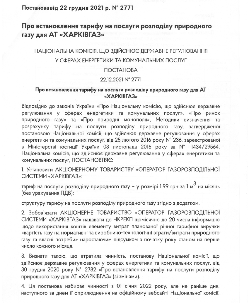 Про встановлення тарифу на послуги розподілу природного газу для АТ "ХАРКІВГАЗ"