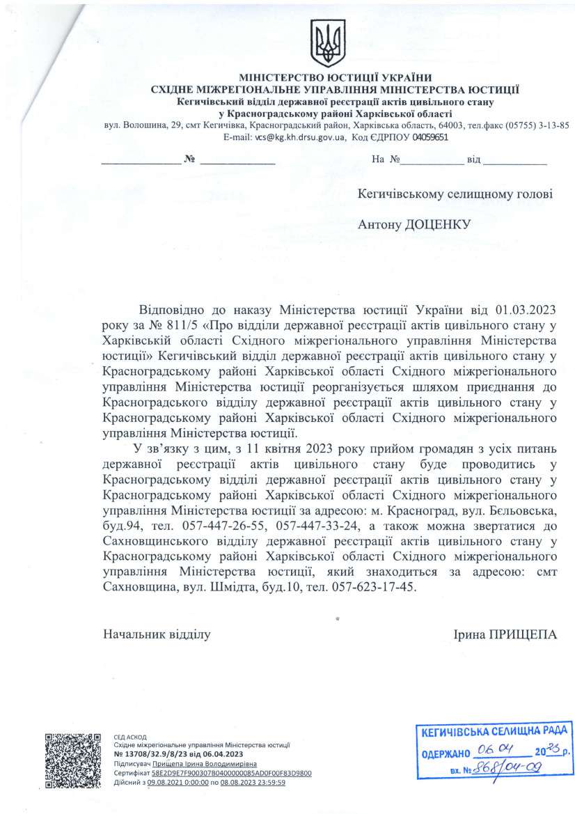Відповідно до наказу Міністерства юстиції України від 01 березня 2023 року № 811/5 «Про відділи державної реєстрації актів цивільного стану у Харківській області Східного міжрегіонального управління Міністерства юстиції» Кегичівський відділ державної реєстрації актів цивільного стану у Красноградському районі Харківської області Східного міжрегіонального управління міністерства юстиції реорганізується шляхом приєднання до Красноградського відділу держаної реєстрації актів цивільного стану у Красноградському районі Харківської області Східного міжрегіонального управління Міністерства юстиції.