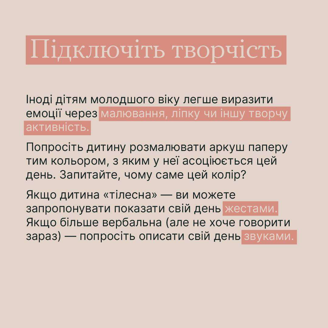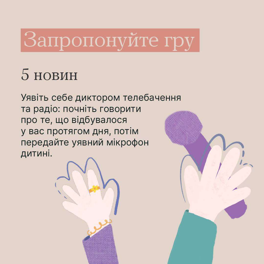Почніть розмову з розповіді про свій день та подивіться на реакцію дитини. Ваш приклад може допомогти їй відкритись та розказати про свій день.