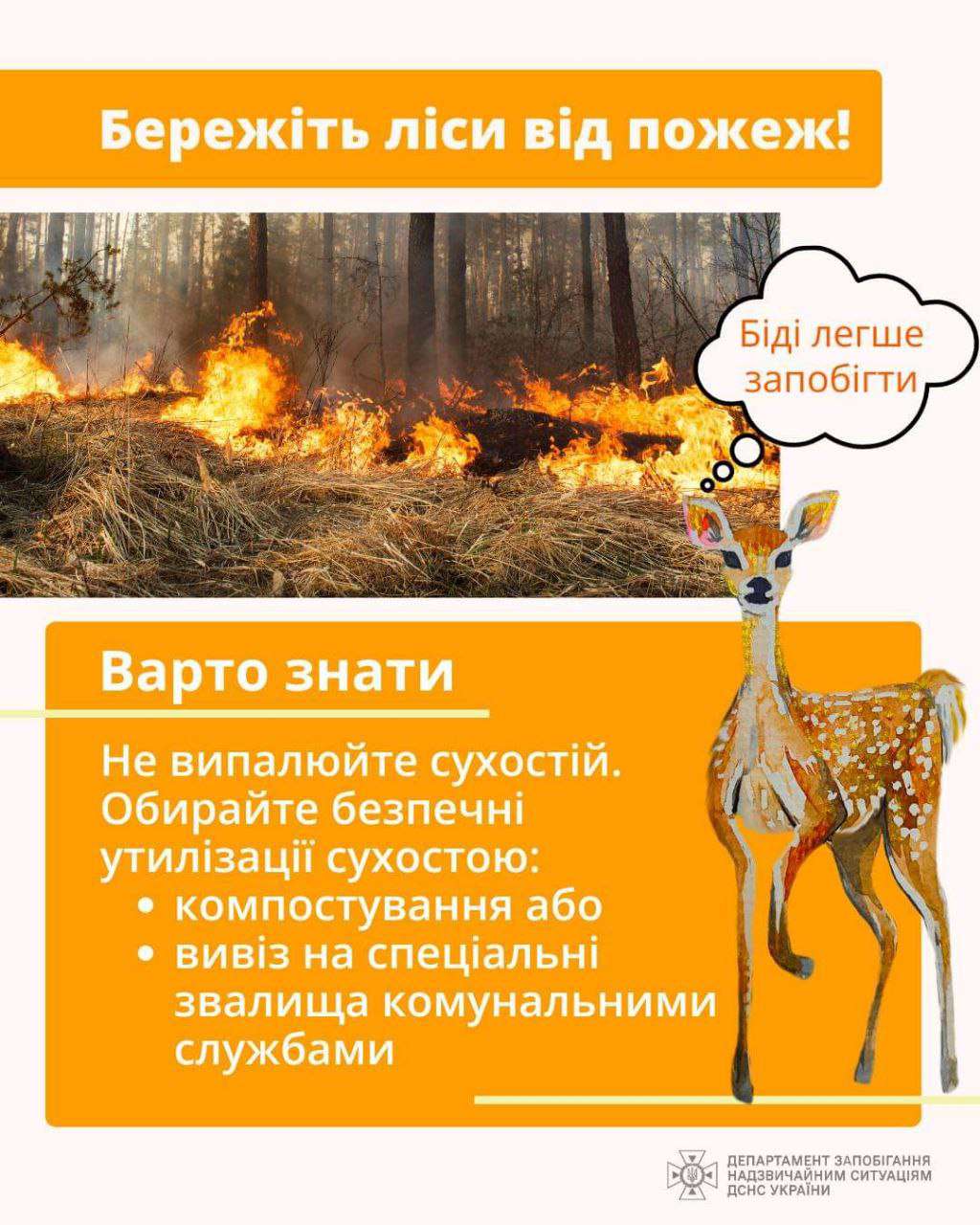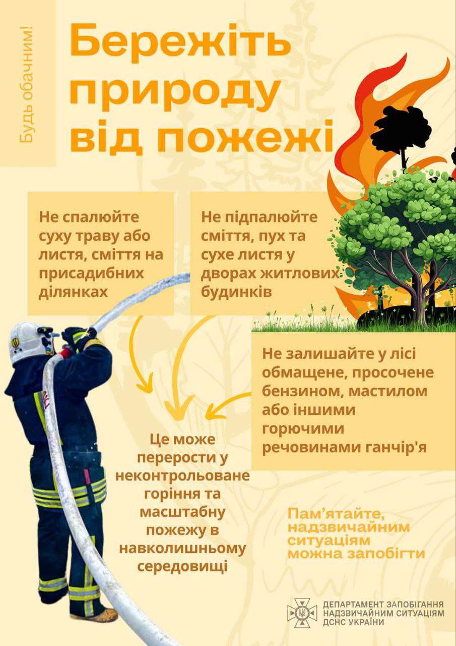 Звертаємо вашу увагу на небезпечність розведення вогнищ на відкритих територіях та під час прибирання присадибних ділянок, випалювання сухої трави та сміття. Адже найчастіше пожежі у природних екосистемах виникають в результаті людської недбалості та неуважності. Наголошуємо на необхідності суворого дотримання правил безпеки, адже порушення елементарних правил пожежної безпеки може стати причиною масштабних пожеж та трагічних наслідків.