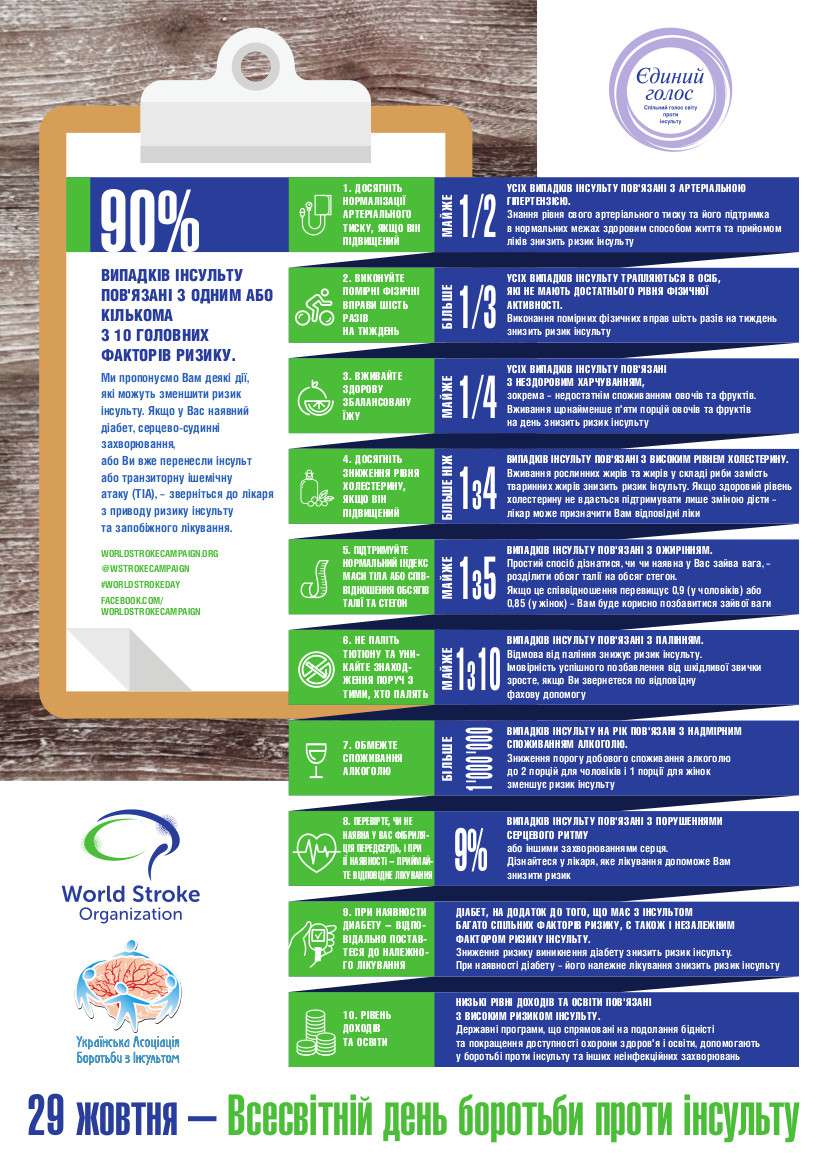За даними ВООЗ, інсульт розвивається у понад 15 млн людей щороку у всьому світі. Із них 5 млн помирають і ще 5 млн – стають людьми з інвалідністю або мають знижену якість життя. Але є хороша новина, яка полягає в тому, що 80% усіх випадків інсультів можна запобігти!
