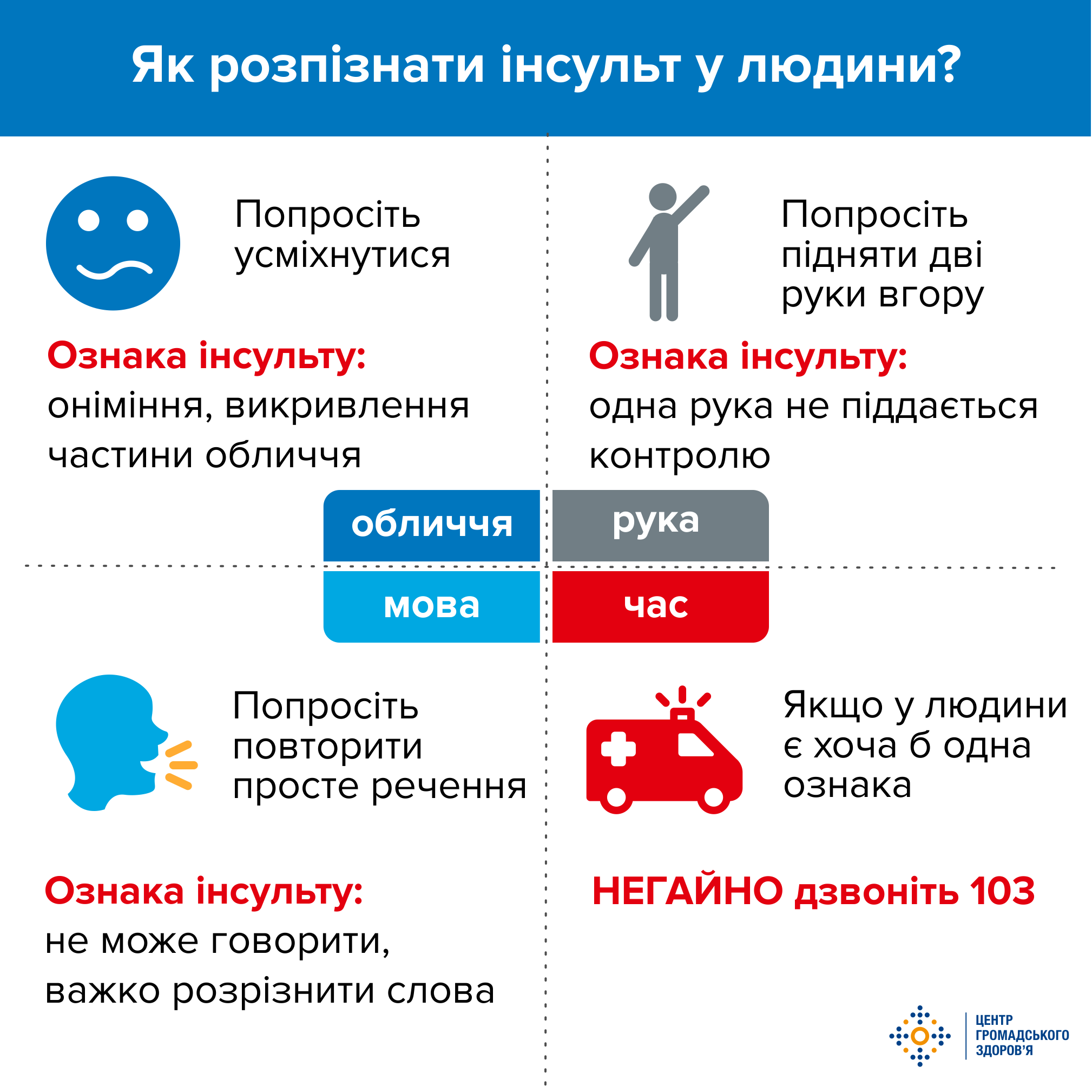 Розпізнавши хоча б один із симптомів інсульту, дійте чітко та швидко за таким алгоритмом: