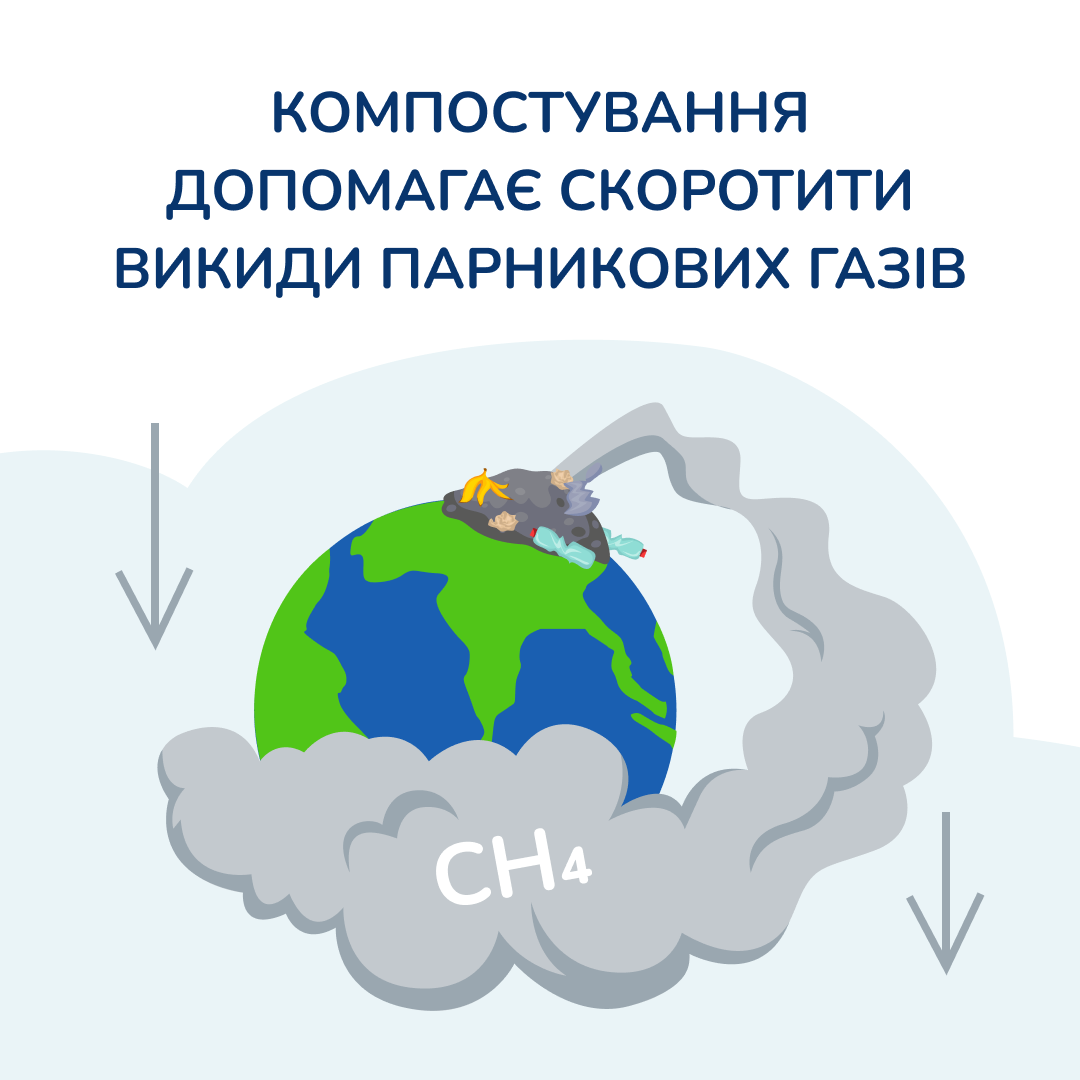 По-третє, компостування допомагає скоротити викиди парникових газів. Розкладання органіки на полігонах створює метан – потужний парниковий газ. Натомість контрольоване компостування значно зменшує ці викиди та сприяє боротьбі зі змінами клімату.