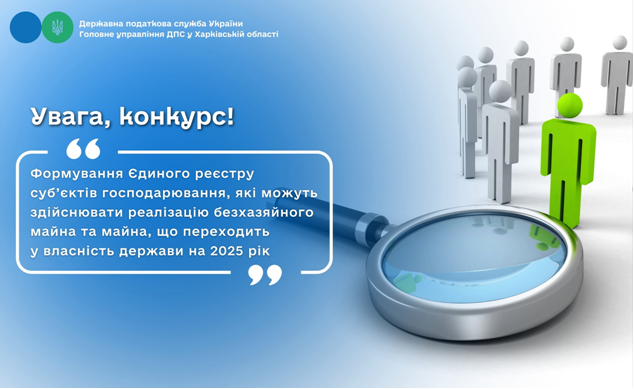 Головне управління ДПС у Харківській області проводить конкурс з формування Єдиного реєстру суб’єктів господарювання, які можуть здійснювати реалізацію безхазяйного майна та майна, що переходить у власність держави на 2025 рік.