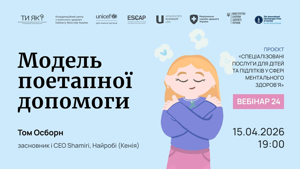 Вебінар «Модель поетапної допомоги» відбудеться 15 квітня онлайн о 19:00. Реєстрація на вебінар «Модель поетапної допомоги» відкрита до 14 квітня за посиланням: https://forms.gle/Mp5morH1nxkX4Mik9.