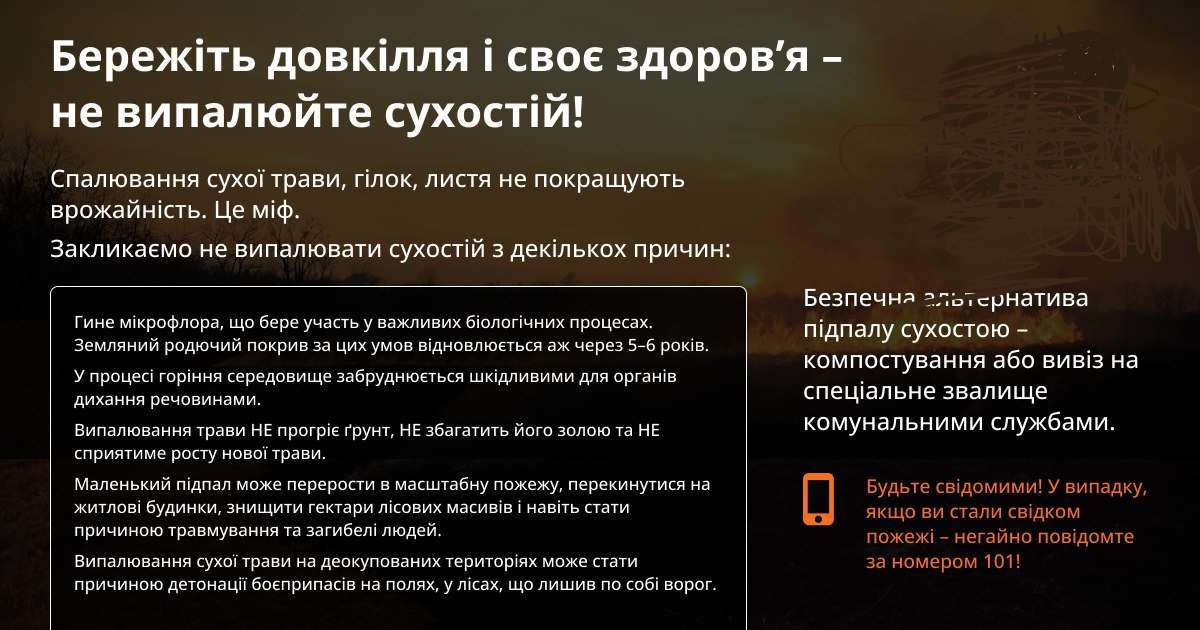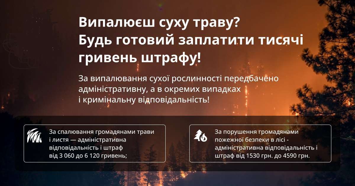 Наголошуємо, що за випалювання сухої рослинності передбачена адміністративна та кримінальна відповідальність!