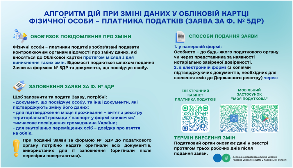 Алгоритм дій при зміні даних у обліковій картці фізичної особи - платника податків (заява за формою № 5ДР)