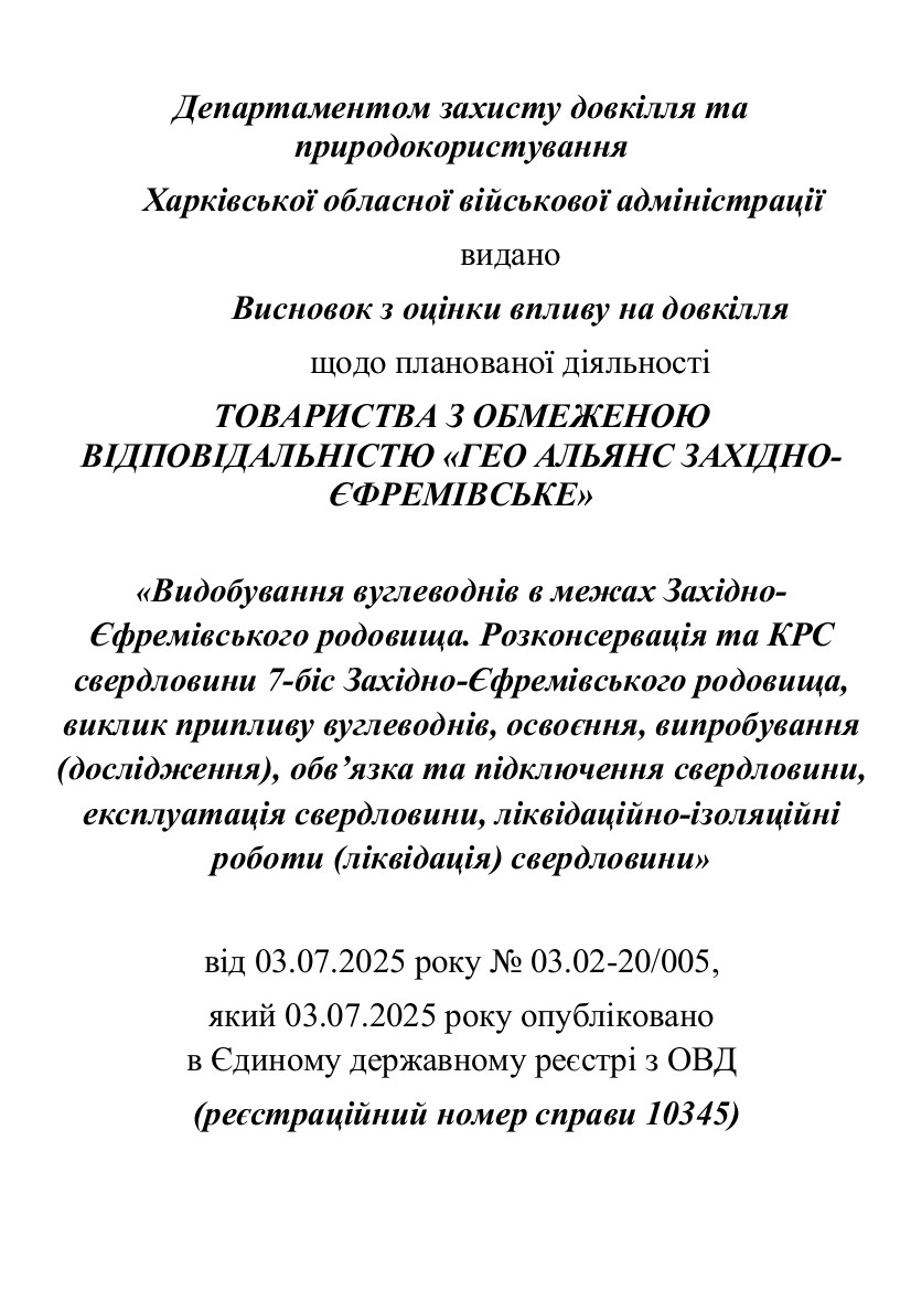 На виконання вимог статті 4 Закону України «Про оцінку впливу на довкілля» повідомляємо, що Департаментом захисту довкілля та природокористування Харківської обласної державної адміністрації (далі – Департамент) надано ТОВАРИСТВУ З ОБМЕЖЕНОЮ ВІДПОВІДАЛЬНІСТЮ «ГЕО АЛЬЯНС ЗАХІДНО-ЄФРЕМІВСЬКЕ» (код ЄДРПОУ 35164714) висновок з оцінки впливу на довкілля щодо допустимості впровадження планованої діяльності з «Видобування вуглеводнів в межах Західно - Єфремівського родовища. Розконсервація та КРС свердловини 7-біс Західно- Єфремівського родовища, виклик припливу вуглеводнів, освоєння, випробування (дослідження), обв’язка та підключення свердловини, експлуатація свердловини, ліквідаційно-ізоляційні роботи (ліквідація) свердловини» (реєстраційний номер 10345 у Єдиному реєстрі з оцінки впливу на довкілля) від 03.07.2025 № 03.02-20/005, який Департаментом оприлюднено 03.07.2025 шляхом розміщення на вебсайті Єдиного реєстру з оцінки впливу на довкілля.